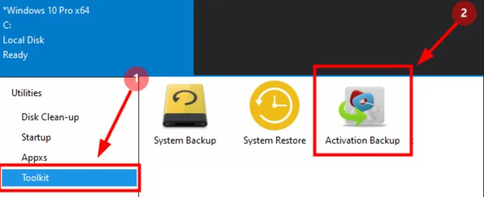- Mở phần mềm Dism++, chuyển đến tab Toolkit và chọn Activation Backup.