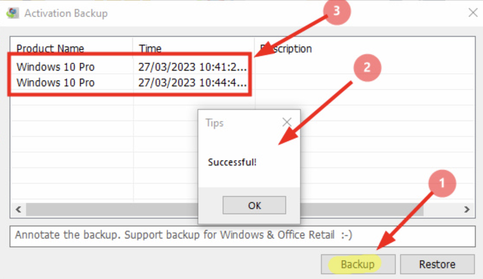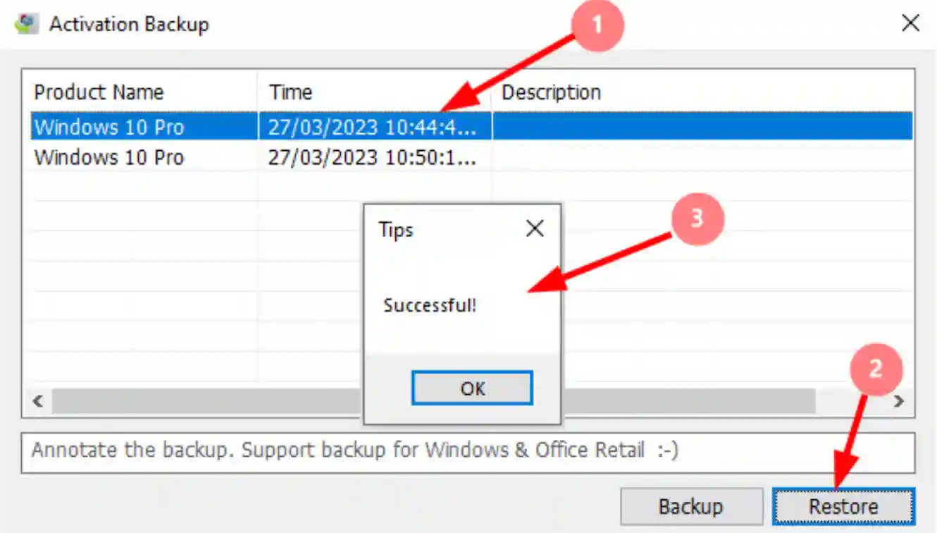 - Nhấn Backup để tiến hành sao lưu bản quyền.