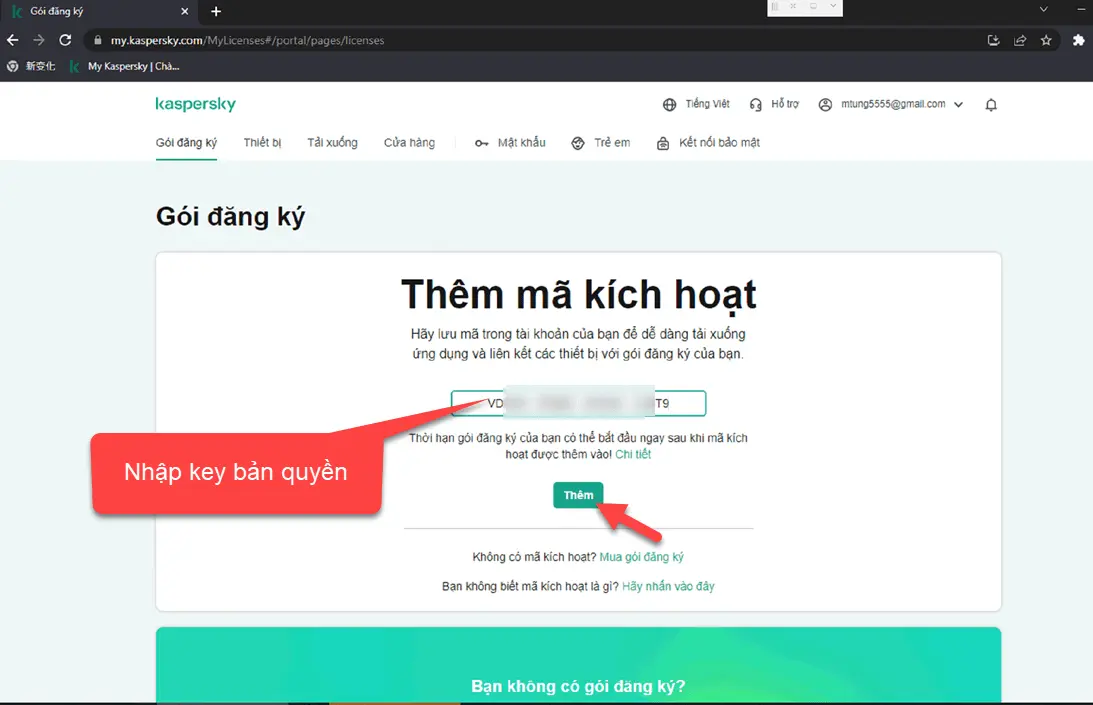 • Nhập key bản quyền gồm 20 ký tự và nhấn “Thêm”.